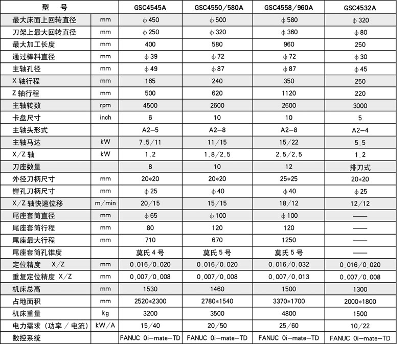 GSC45系列卧式斜床身全功能数控车床是一种中等规格、高效通用自动化机床。该系列机床配备了先进的FANUC 0i-Mate-TD系统,具有CNC标准功能,同时配装八/十/十二工位液压转塔刀架或排刀装置,以满足切削时自动换刀需要,可完成多种工序的车削加工。该机床广泛适用于军工、汽车、航空、模具等制造行业的各种零件的精密加工。同时由于机床刚性好,加工精度稳定,适合于各种轴类、盘类零件的中、大批量生产。 本机主轴单元为独立主轴(套筒式),电机直连无级调速结构。可选配高精度的SKF、FAG及NSK、NTN等著名品牌的主轴专用轴承,同时使用进口专用轴承润滑脂,整个主轴单元精度高、刚性好。主轴经严格的动平衡测试,精度高,精度保持性良好,热变形小。热稳定性佳,最高转速可达4500RPM。 进给系统全部由伺服电机直联驱动、刚性、精度、动态响应特性好。两轴导轨均采用中等预压的线性导轨。