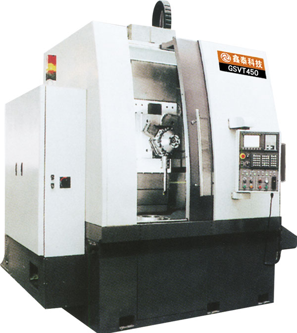 GSVT系列立式数控车床是一种中等规格的机电一体化车削中心,配备了先进的SIMENS 802S系统,具有CNC 标准功能,配装八工位液压转塔刀架或者排刀装置,可完成多种工序的车削加工。该机床广泛适用于军工、汽车、航空、模具等制造行业的各种零件的精密加工,特别适合于各种盘类零件的大批量生产。 GSVT系列床身为直立式结构的优质铸铁件,辅以先进的填充工艺,整机基础稳定可靠,抗震性能极佳。所有轴承跨距经过严格的优化设计,确保主轴刚性的最优化。采用大功率变频主电机和线性导轨,导向精度高,摩擦力小。两轴线轨均采取准确的预紧力安装。GSVT750的X向导轨使用3根线轨并列挂壁式布置,滑鞍轻盈敏捷,动态性能优异,在主切削力方向上承载刚性极高,且增加X向滑鞍抗颠覆力矩能力。Z向导轨使用双线性导轨布置,确保刀架在切削时的抗颠覆性。