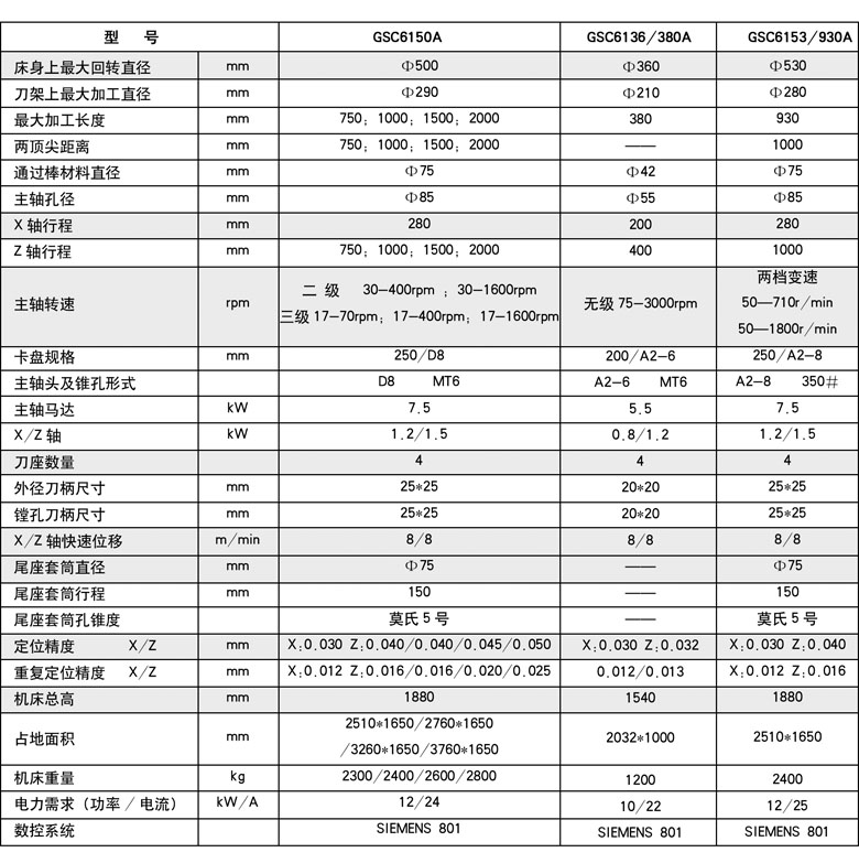 GSC61系列卧式平床身数控车床是一种中等规格、高效通用自动化机床。该系列机床配备了先进的SIEMENS系统,具有CNC标准功能,同时配装四工位电动转位刀架或者排刀装置,以满足切削时自动换刀需要,可完成多种工序的车削加工。该机床广泛适用于军工、汽车、航空、模具等制造行业的各种零件的精密加工。用户根据需要可选配多种数控系统。该系列机型也适合做为教学用机使用。